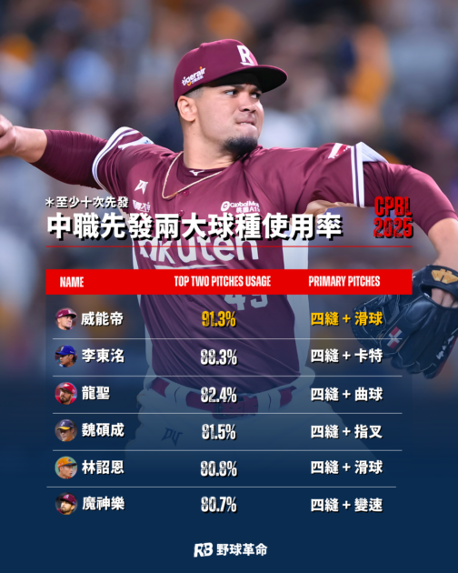 無論先發或中繼型,多球種投手都是主流。其中鄭浩均和郭俊麟都有各五種球種使用率超過10%,武器庫十分豐富。不過同樣擁有多元球種,鄭浩均和郭俊麟在2025年球季的成績卻有不小落差,因此比起廣泛的使用不同球種,能否將使用的球種發揮到淋漓盡致,才是最大的關鍵。