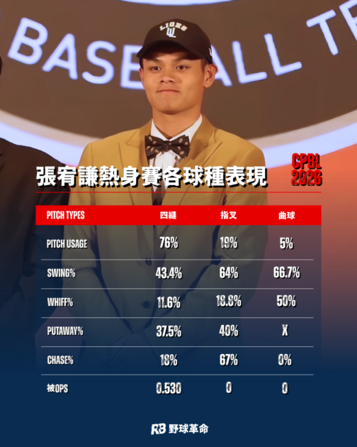 在熱身賽10.1局的投球中,張宥謙被打出五支安打、兩支長打,送出兩次保送與四次三振。他的直球均速僅140公里、最快143公里,在球速不快、各球種製造的揮空率也不高的情況下,四次三振不算多。但相對的,細品張宥謙的投球內容,可以發現他能夠有效地壓制打者的破壞力,根據野革的紀錄系統,張宥謙在熱身賽一共有33球被擊球入場(BIP),BIP%相當高,且其中絕大多數是中弱強度的飛球或滾地,紮實的平飛僅有一顆、較強勁的飛球也僅有一顆。特別可以關注的是張宥謙的指叉球,這是他從高中時期就相當倚賴的武器,投入在熱身賽的賽場中也收到不錯的效果。當然,年輕的張宥謙對於指叉球的控制力還有待加強,目前還是經常出現提早下墜的明顯壞球,但不少顆接近本壘板才下墜的軌跡,都能夠有效讓打者擊出不營養的擊球,特別在兩好球後與四縫線速球去做的搭配收到很好的效果。