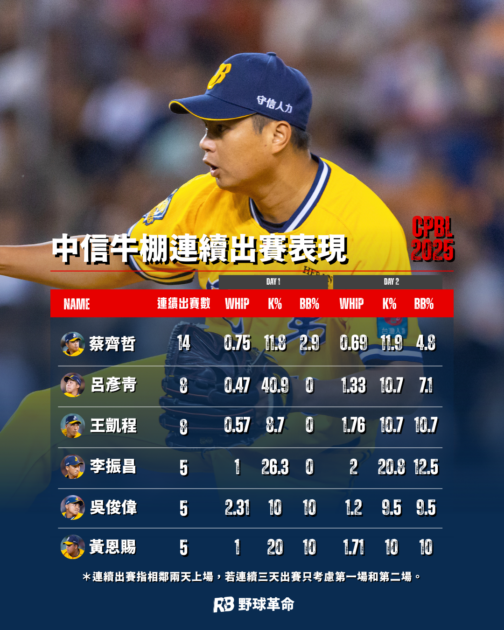 相較之下,蔡齊哲則呈現另一種使用方式。他在2025賽季是球隊所仰賴的拆彈手,一共累積14次連續出賽,為全聯盟最多。不過即便蔡齊哲可以說是天天組的代表,他整季的ERA2.4卻表現非常優異,即使在連續出賽下保送率些微提升,整體來說仍能維持一定的壓制力。
